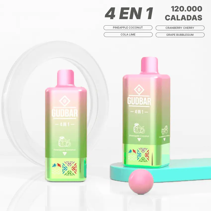 Gudbar 4 en 1 Pineapple Coconut (sin nicotina) es un dispositivo pensado para quienes buscan variedad, sabor y facilidad de uso en un solo vape. Gracias a su sistema giratorio, puedes cambiar entre cuatro sabores diferentes de forma rápida y sencilla, sin botones ni configuraciones.
