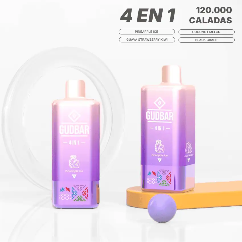 Gudbar 4 en 1 Pineapple Ice (sin nicotina) es un dispositivo diseñado para quienes buscan variedad, frescura y facilidad de uso en un solo vape. Gracias a su sistema giratorio, puedes cambiar entre cuatro sabores diferentes de forma rápida y sencilla, sin botones ni configuraciones.