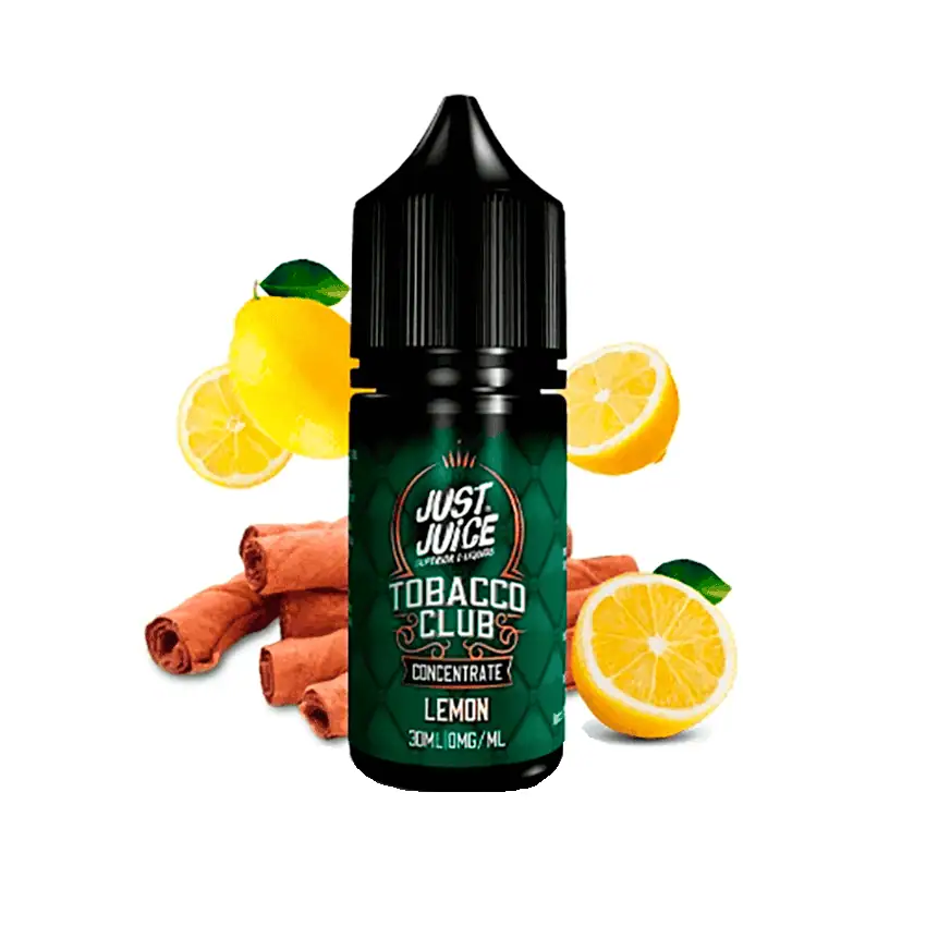 Tobacco Club Lemon Concentrate 30ml. Este concentrato tiene una base de tabaquil, uno de los tipos de tabaco más antiguos y populares del mundo, cultivado en Virginia USA, junto con un toque picante y cítrico del limón, lo que hace tan especial este nuevo aroma de Just Juice.