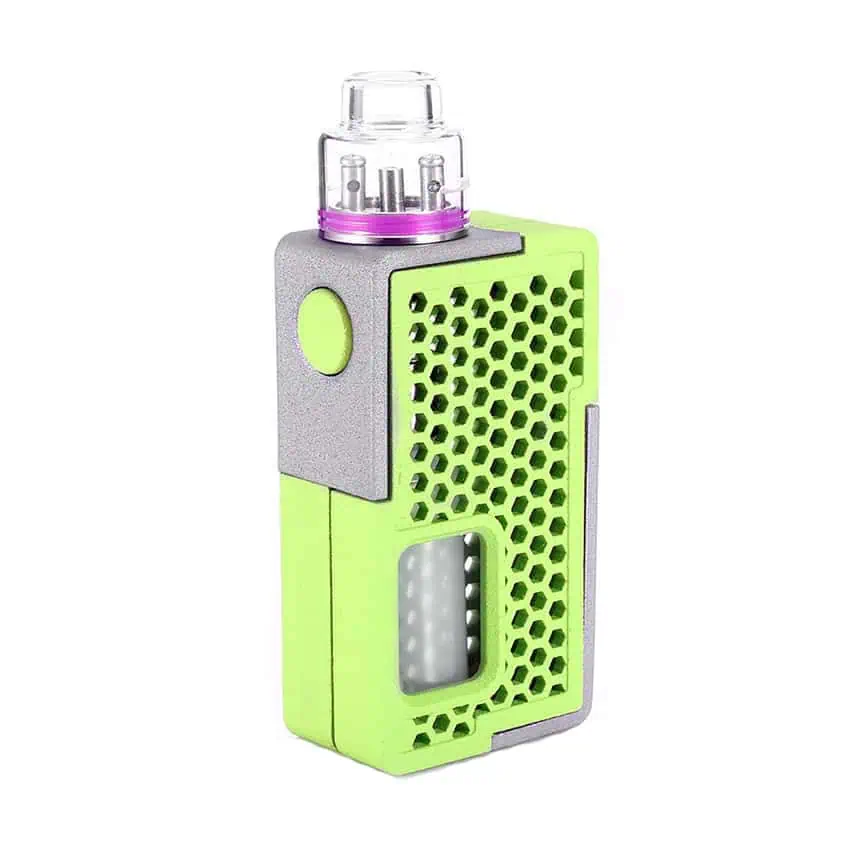 Este es el PRIMER mod impreso en 3D en China por Yiloong Vape. Este mod es un dispositivo no regulado que tiene una conexión de cobre 510 para admitir una alta eficiencia y rendimiento. Además, el diseño del panel hueco lo hace diferente y permite una buena difusión del calor. El interruptor de disparo, los logotipos de la letra X se encuentran en el costado del dispositivo. El tamaño de 80 x 45 x 25 mm lo hace delgado y pequeño para sostenerlo en las manos. El Mod Funciona con una bateria 18650 (no incluida) y una botella squonker extraíble de gran capacidad. Por lo tanto, puede reemplazar fácilmente la batería 18650 y la botella de líquidos. Los paneles son varios y de diferentes colores como rosa, naranja y verde.